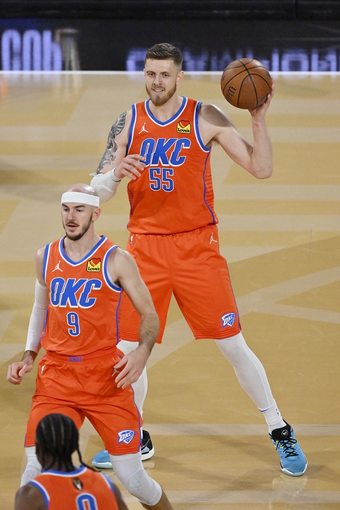 卡鲁索为亚历山大设置的高位掩护屡次撕裂掘金联防,他永不停歇的拼抢为雷霆赢得无数二次进攻机会。卡鲁索更是展现了顶级篮球智商,比如指挥亚历山大击地传给霍姆格伦空切,随即反跑甩开阿隆-戈登完成反手上篮。卡鲁索在防守端的价值更为耀眼:无论是低位绕前阻断约基奇接球,还是作为协防者封堵威少的突破路线,都印证了其联盟第一的防守真实正负值。