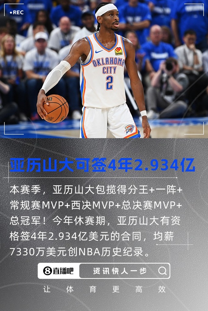 今年夏天,亚历山大有资格和雷霆签下一份4年2.934亿美元的超级顶薪提前续约合同(6550万美元、7070万美元、7600万美元、8120万美元),均薪7330万美元将创NBA历史纪录;亚历山大很可能成为首位单赛季薪资超过8000万美元的球员。