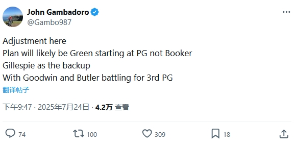 Gambadoro此前报道称,布克会在新赛季出任首发控卫,但他后来调整了自己的说法。
