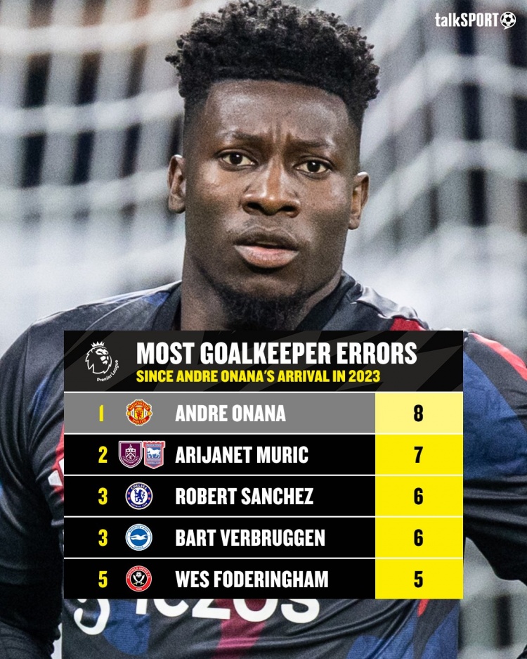 4月13日讯 据多家英媒报道奥纳纳今晚没进曼联的大名单,对此,英媒talksport统计了自奥纳纳2023年加盟曼联以来英超的门将失误榜 ,其中奥纳纳以8次失误登顶榜单。