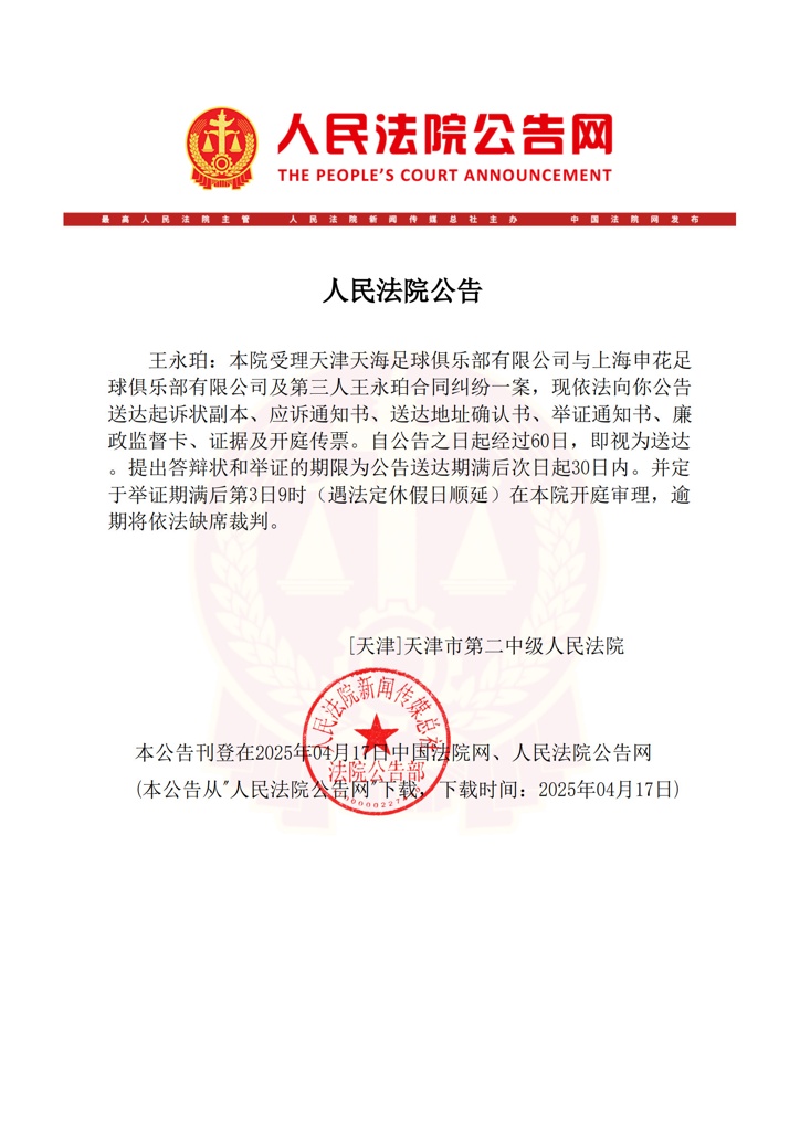 04月17日讯 天津市第二中级人民法院发布公告,受理天津天海与上海申花和王永珀合同纠纷一案,向王永珀送达开庭传票。