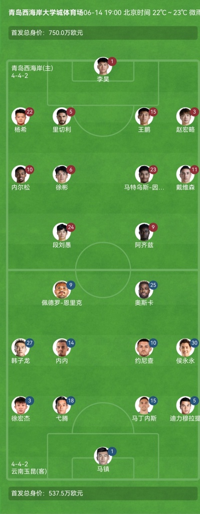 06月14日讯 北京时间19点,中超第14轮,青岛西海岸主场迎战云南玉昆,赛前双方公布首发。