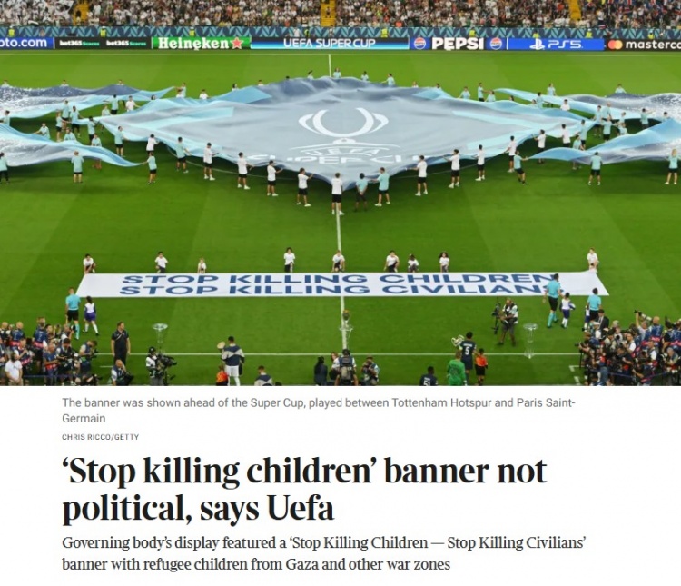 8月14日讯 欧足联坚称,在热刺对阵巴黎圣日耳曼的超级杯赛前展示的“停止杀害儿童——停止杀害平民”横幅并非政治宣言,而是人道主义呼吁。