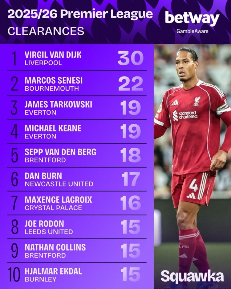 本赛季英超解围榜:范迪克30次居首,塞内西22次第二