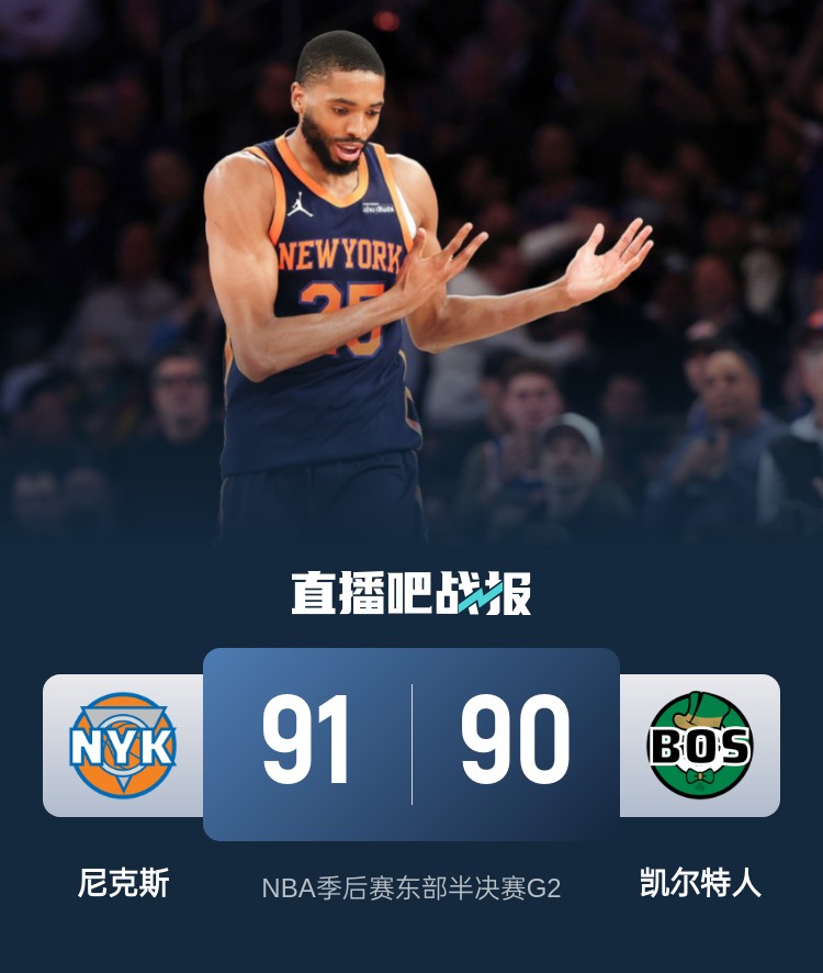 比赛开始,双方上来都比较慢热,但凯尔特人半节还是9-2建立主动权,随后杰伦-布朗连续强打助队拉开双位数领先,怀特和普理查德连续扔进三分首节领先11分,次节唐斯连续强打内线砍下8分带队咬住比分,但杰伦-布朗里突外投单节上双强势回应,塔图姆还是没有手感,半场绿军领先9分。下半场,塔图姆里突外投连砍5分,双方展开拉锯战,随后绿军再次发力9-0拉开20分以上领先,尼克斯回应8-0追到差12分,末节双方继续拉锯战,布里奇斯终于回暖接连中远投连砍7分,但普理查德连续三分强势回应,随后绿军突然断电,布伦森带领尼克斯稳扎稳打,一波13-0直接反超3分,塔图姆追进2罚后又突破暴扣反超回来,布伦森两罚全中再反超,大桥封杀抢断塔图姆,最终尼克斯91-90逆转凯尔特人,大比分2-0领先。
