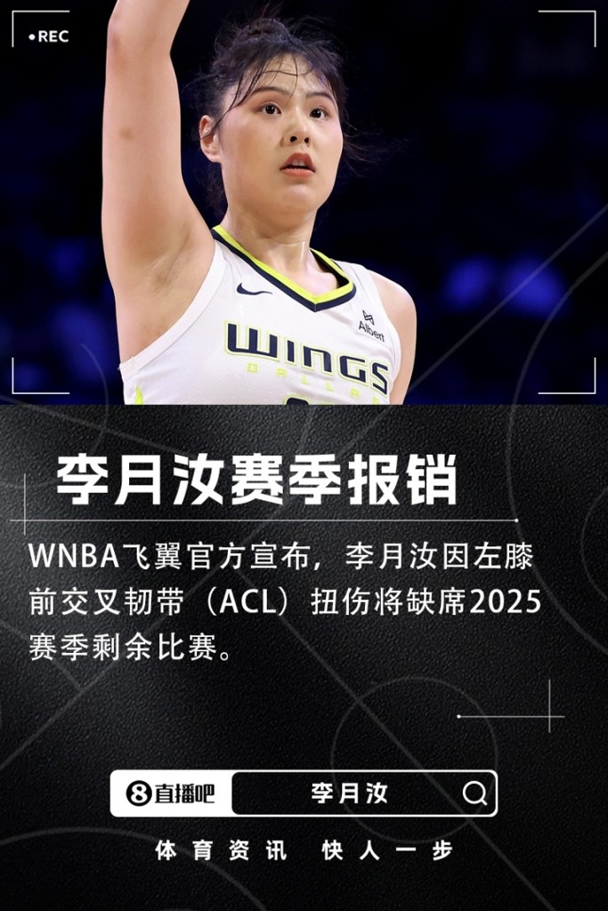 08月20日讯 WNBA飞翼官方宣布,李月汝因左膝前交叉韧带(ACL)扭伤将缺席2025赛季剩余比赛。