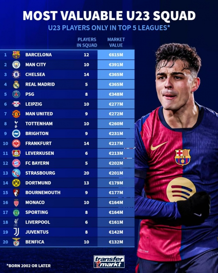 五大联赛队内U23球员身价榜:巴萨6.15亿欧高居榜首,曼城次席