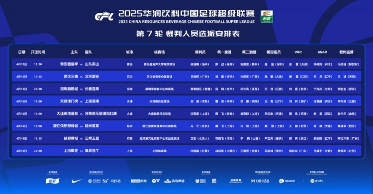 4月15日讯 中超联赛官方公布了第7轮裁判人员安排,其中马宁执法浙江队vs梅州客家,麦麦提江执法新鹏城vs亚泰。