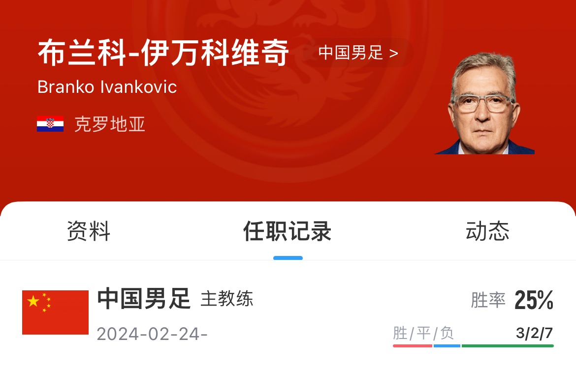2024年2月24日,足协官宣伊万出任国足主帅。目前带队国足12场比赛,取得3胜2平7负的战绩,胜率为25%。