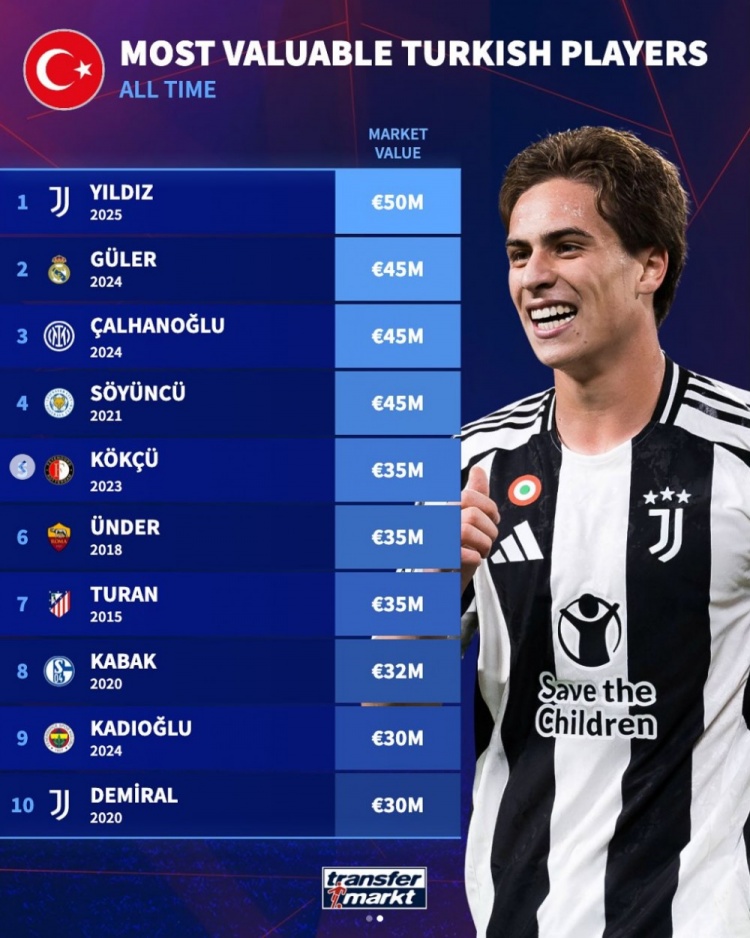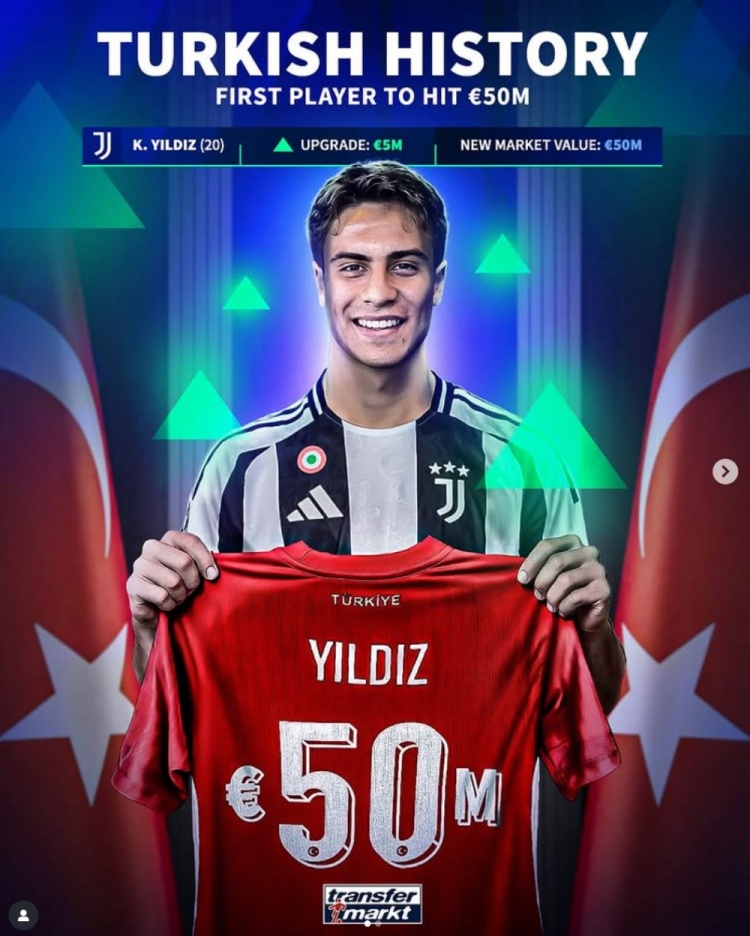 据德转统计,本次身价更新后伊尔迪兹成为历史上身价最高的土耳其球员,历史上首次有土耳其球员德转身价达到5000万欧。