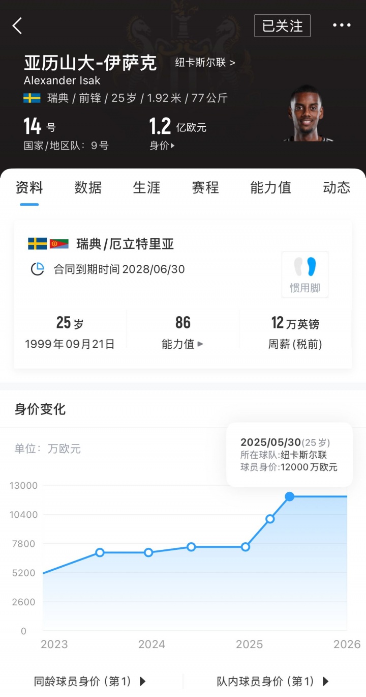 然而伊萨克开口就要近30万镑的周薪,这一要求远远超出了俱乐部的预期。伊萨克的现有合同还剩3年,这意味着纽卡的续约压力还不大。