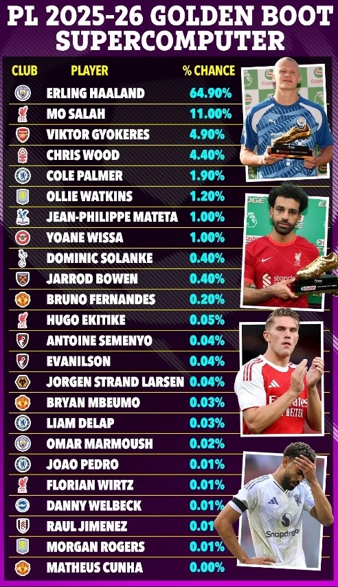 超算预测英超金靴:哈兰德64.9%遥遥领先,萨拉赫第2约克雷斯第3