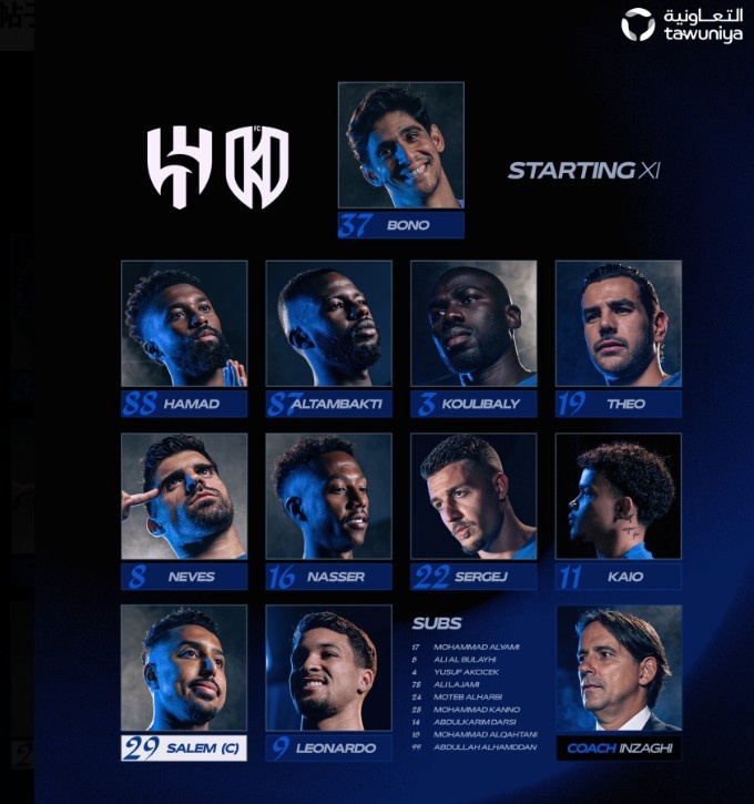 利雅得新月首发:特奥、内维斯、米林出战,努涅斯、坎塞洛缺阵